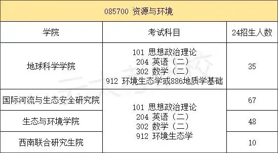 关于912资源与环境,在2024考研招生目录发生变动,云南大学资源与环境专业硕士研究生有四个学院进行招生,地球科学学院、国际河流与生态安全研究院、生态与环境学院、西南联合研究生院。所以这就需要25考生在备考的时候确定自己所报学院,具体了解好相关的要求。