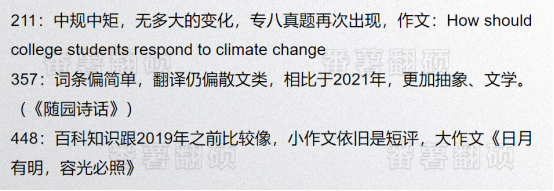 Ø 357的出题方向,有一点偏重于防疫。2022年词条的分值降低,翻译的占比更大。翻译相较于2021年考得更加的文学,而且更加的散,很考验大家的文学功底。